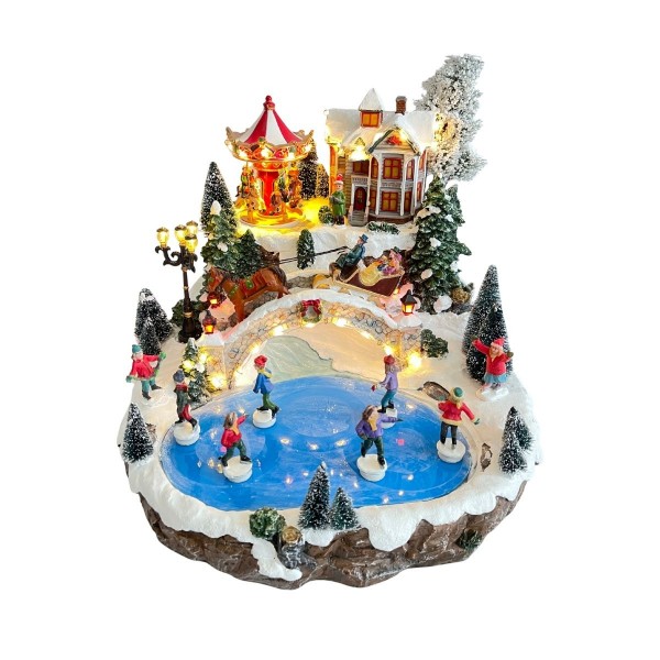 Villaggio con pattinatori, perfetto per ricreare l’atmosfera fiabesca del Natale con luci e suoni