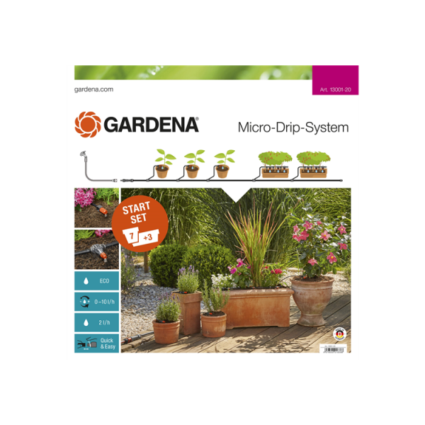Lo Start Set per vasi M Micro-Drip-System GARDENA contiene tutto il necessario per irrigare 7 piante in vaso e 3 fioriere in balcone o terrazzo in modo semplice e risparmiando acqua. Il riduttore di pressione si collega al rubinetto o al computer per irrigazione tramite l'adattatore in dotazione. Le piante vengono irrigate in modo preciso e mirato tramite i gocciolatori.
