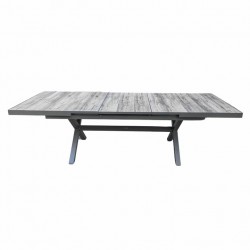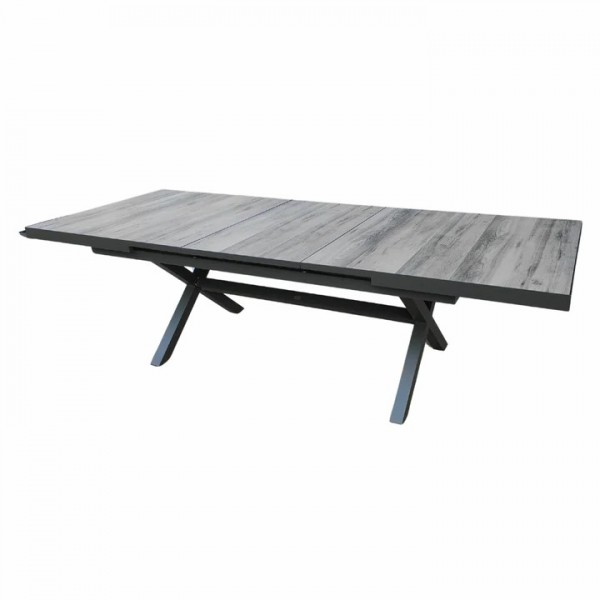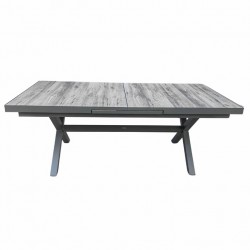 Set pranzo New Fusion composto da: 1 tavolo rettangolare 200/260x100xH75cm allungabile con apertura centrale automatica in alluminio colore antracite con top composto da 13 stecche in ceramica grigia, 6 sedie New Fusion in alluminio antracite con braccioli impilabile con seduta in textilene imbottito grigio
